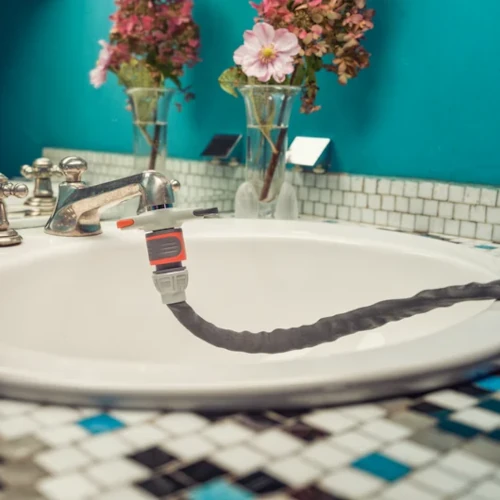 O conector de torneira para torneiras interiores da GARDENA faz com que os cansativos passeio para encher o regador para regar as suas plantas na varanda sejam coisas do passado. Graças ao conector de torneira, pode alcançar convenientemente as flores da sua varanda.