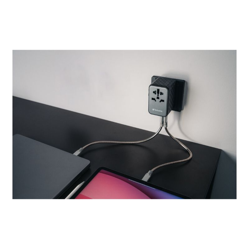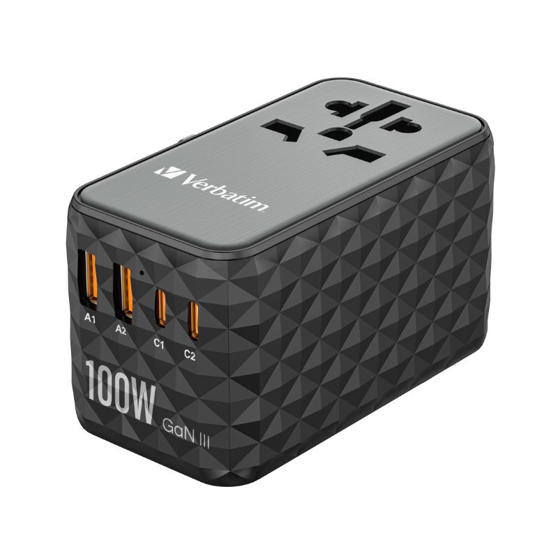 - 1 Adaptador de viagem universal Verbatim UTA-06 GaN III com 2 x USB-C PD 100 W e QC 4+ / 2 x USB-A QC 3.0