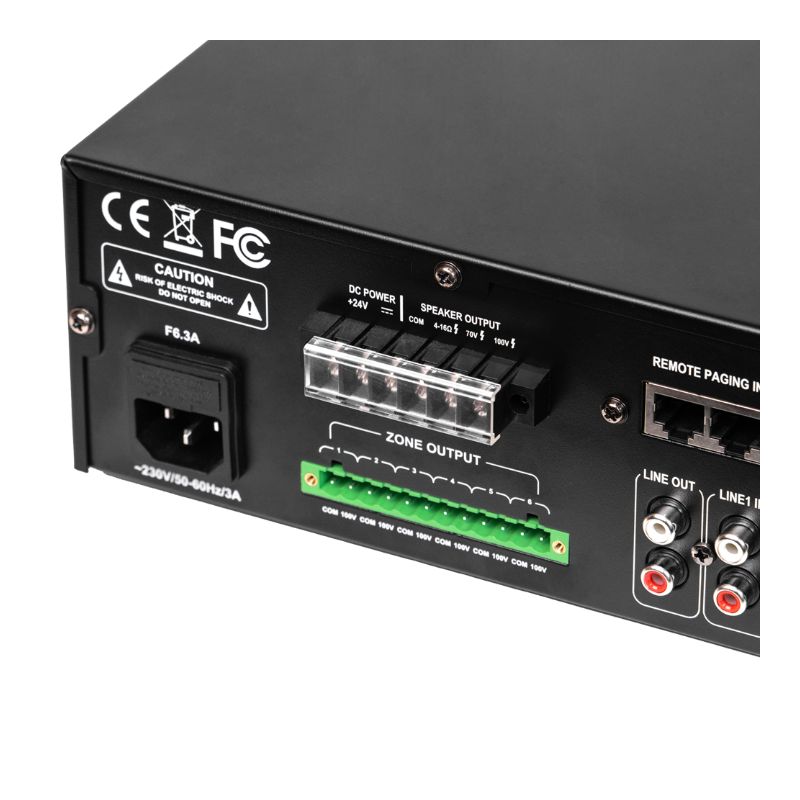 | Entradas | 1 x LINE (RCA) 1 x MIC (XLR equilibrado) 3 x MIC / LINE (Jack Phoenix não equilibrada) 2 x AUX (1 x AUX RCA não equilibrada, 1 x AUX Jack Phoenix não equilibrada) 2 x Entrada de microfone de avisos DSPPA-DMA20 (RJ45 com alimentação DC +24V) 1 x Sinal de emergência (EMC) (Jack Phoenix não equilibrada) |