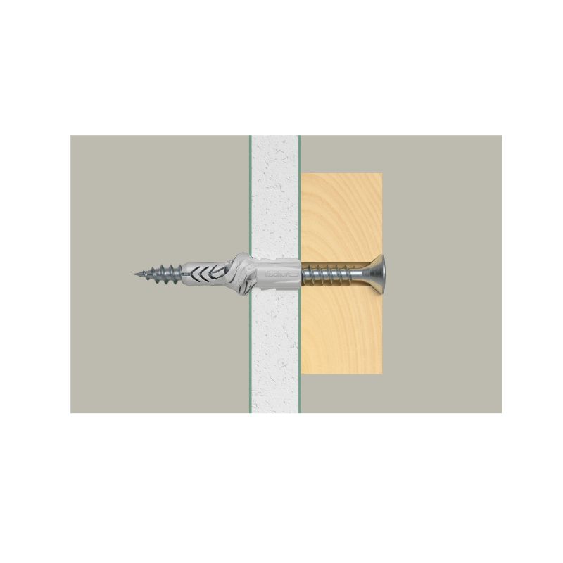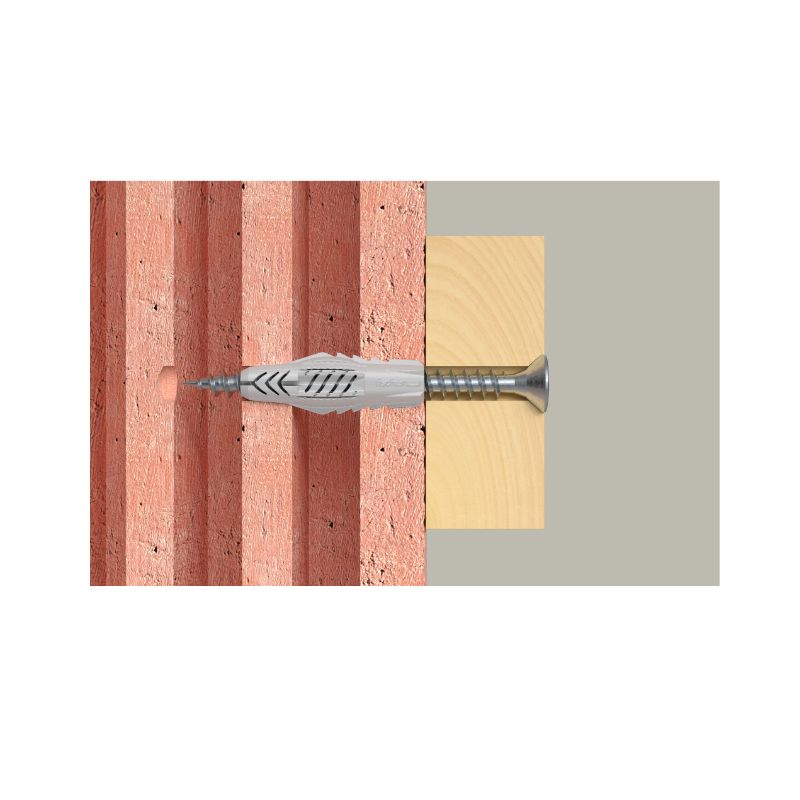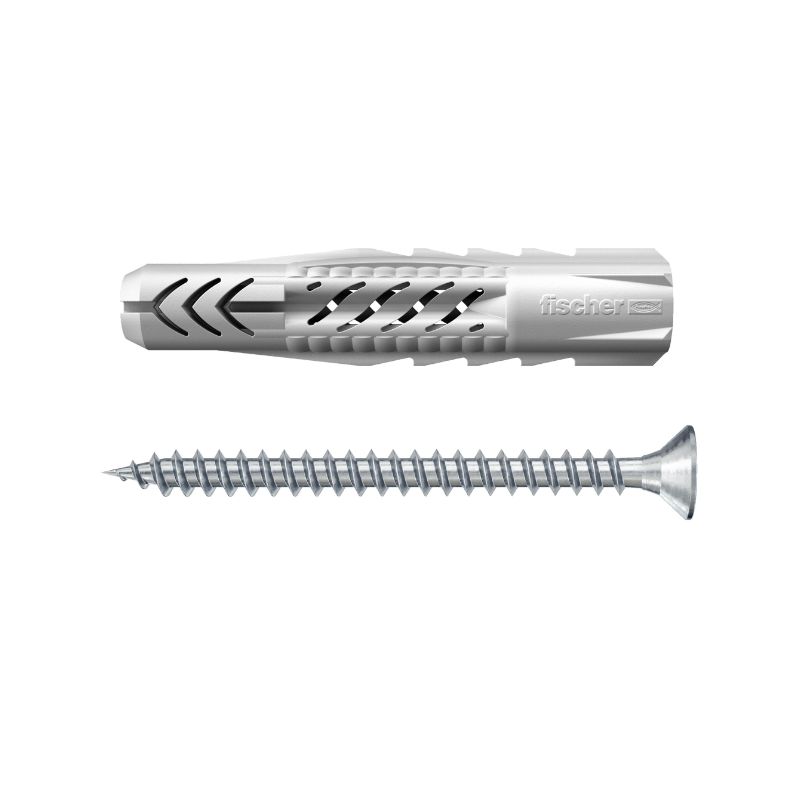 A bucha universal UX da fischer é uma bucha de plástico fabricada em nylon de elevada qualidade. A bucha universal expande em materiais de construção maciços e entrelaça-se em materiais de construção ocos e em painéis de construção, para uma máxima retenção. Isto faz com que a UX da fischer seja sempre a escolha certa – mesmo quando não sabe qual é o material de construção. O rebordo impede que deslize para dentro do furo durante a instalação. Na versão sem rebordo, e profundidades de ancoragem maiores, a bucha universal UX da fischer é indicada para instalação de encaixe. A bucha universal UX da fischer é recomendada, por exemplo, para a fixação de candeeiros, varões para cortinas, armários leves e rodapés. Os conjuntos de fixação com parafusos, olhais e ganchos, são a melhor solução para praticamente todas as aplicações.