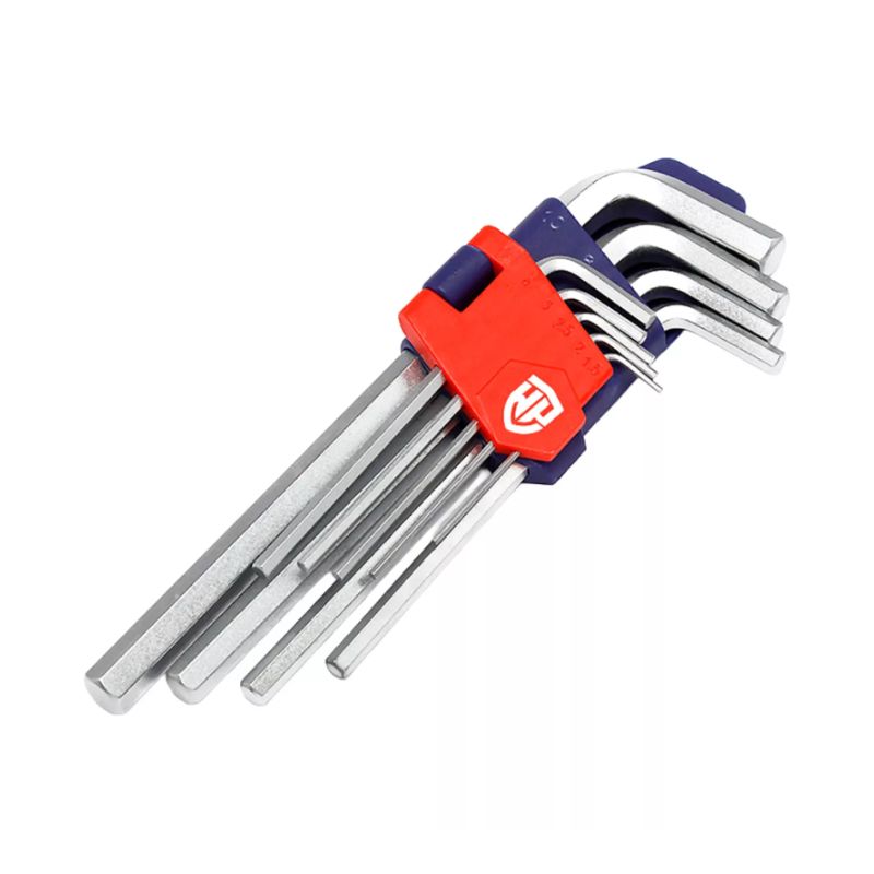 Chaves Allen CR-V da WorkPro em um jogo de 9 peças. Fabricadas em cromo vanádio, com peso de 0,638 kg e medidas métricas variando de 1.5 a 10 mm, incluindo tamanhos de 2, 2.5, 3, 4, 5, 6, 8 mm.