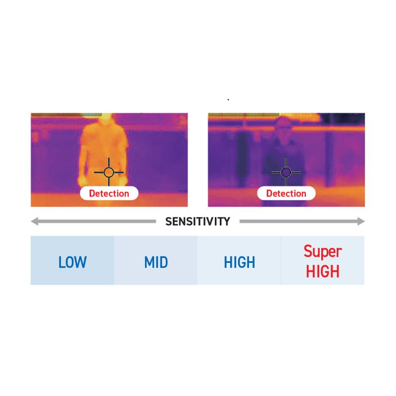 - Sensibilidade superalta: para maior desempenho e precisão, os modelos avançados oferecem um avanço em relação às configurações de sensibilidade habituais, aumentando o desempenho de detecção. Normalmente, os nossos sensores podem vir com sensibilidade baixa, média ou alta, mas para tornar este produto ainda mais adequado para locais de alto risco, incorporámos a «sensibilidade superalta», que, quando ativada, permite que os sensores mantenham uma detecção estável e altamente fiável, mesmo quando a diferença de temperatura entre o ser humano e o ambiente é muito pequena.