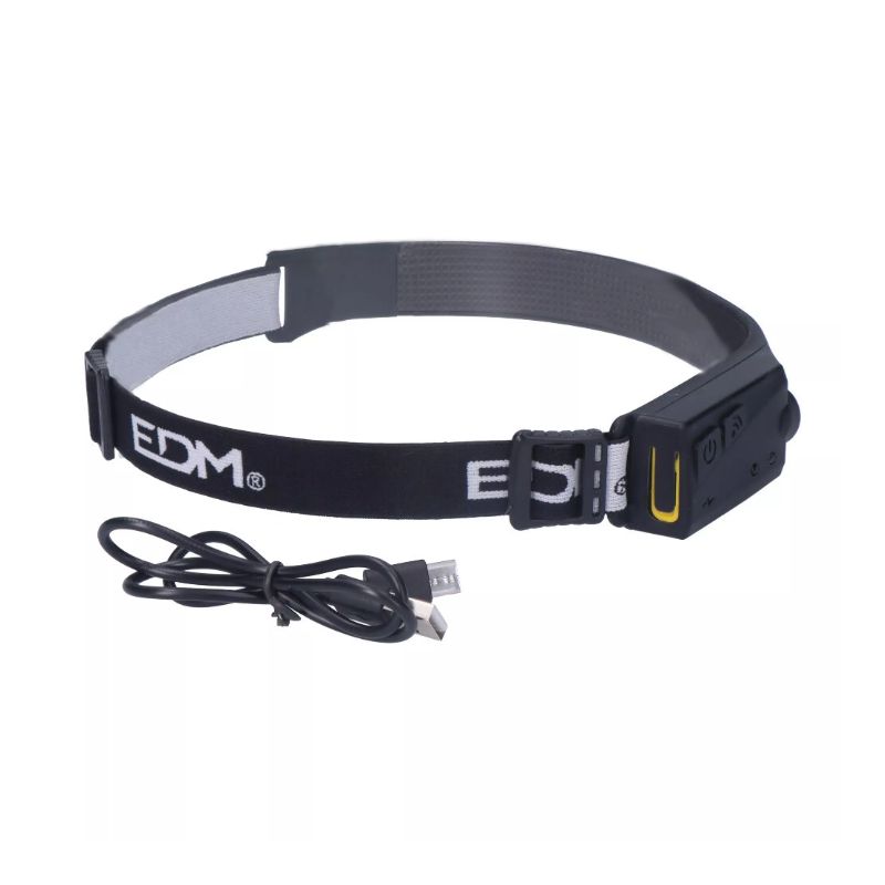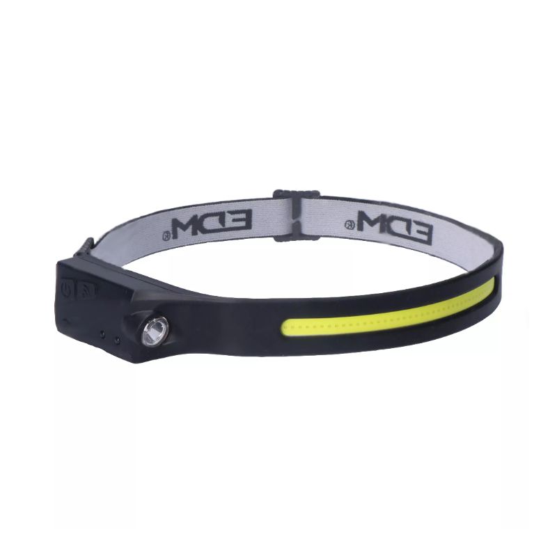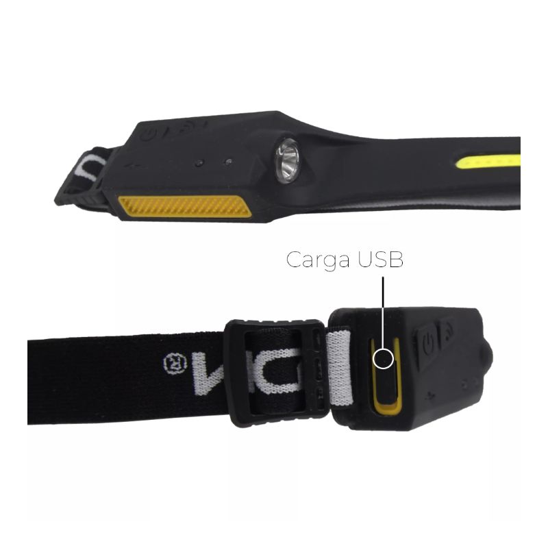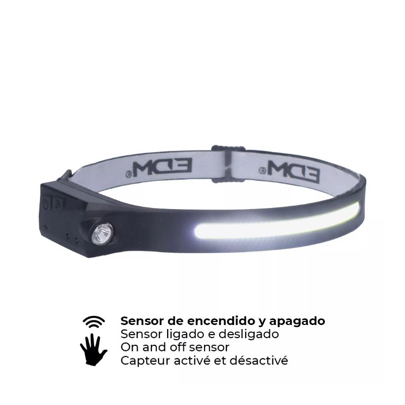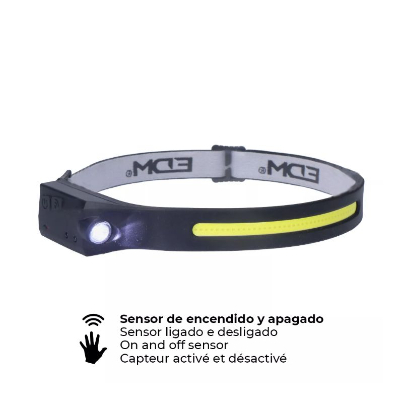 Lanterna de Cabeça com Sensor Recarregável, com peso de 0,096 kg, é equipada com um cabo USB tipo C e possui uma luminosidade de até 280 lm através de LEDs COB de 8W e LED spot de 3W, oferecendo múltiplas intensidades de luz. O sensor de ativação possui alcance de 10 cm, com autonomia de até 5 horas e um tempo de carregamento de aproximadamente 2,5 horas. É antiderrapante, resistente ao desgaste, e possui proteção contra sobrecarga e descarga. O design é em material tipo borracha, com proteção IP44 e temperaturas de luz de 6.500 K e 7.500 K. Dimensões: 34 x 2 x 3 cm.