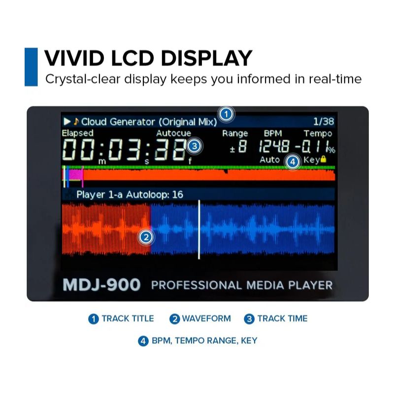 O MDJ-900 reúne inúmeras funcionalidades profissionais num leitor multimédia compacto e inovador. A facilidade de utilização permite-lhe misturar sem esforço, sem necessidade de software externo. Possui um grande ecrã de 8″ com uma roda jog sensível ao toque e, ao utilizar os modos Link e Sync, permite-lhe ligar até 4 PLAYERS diferentes com correspondência de tempo em cada MDJ-900, libertando-o para criar misturas mais complexas em tempo real. Os DJs vão obter um excelente retorno do seu investimento com o MDJ-900. Se procura uma porta de entrada para criar uma mistura que seja exclusivamente sua, o MDJ-900 é a melhor aposta.