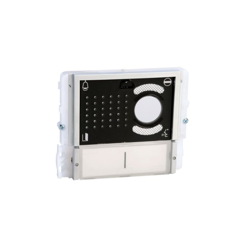 - Módulo preparado para porteiro áudio/vídeo, com máscara serigrafada preta. Cartões porta nomes com iluminação por led, seleccionável entre azul, branco e desligado. A complementar com respectivo porteiro vídeo-intercomunicador que depende do sistema de cablagem utilizado. Dimensões: 112×89,5×32 mm.