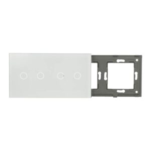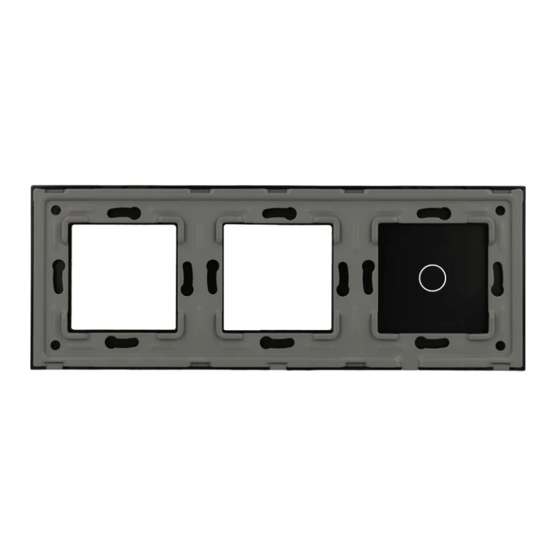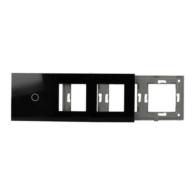 Painel em cristal temperado preto com 1 botão touch retroiluminado para controlo de 2 dispositivos. Design alongado (228mm) e ultrafino (16mm) para instalação em molduras duplas. Interface sensível ao toque com feedback visual para sistemas de automação residencial. Acabamento preto sofisticado que adiciona um toque moderno a qualquer espaço — ideal para projetos de smart home com estilo minimalista.