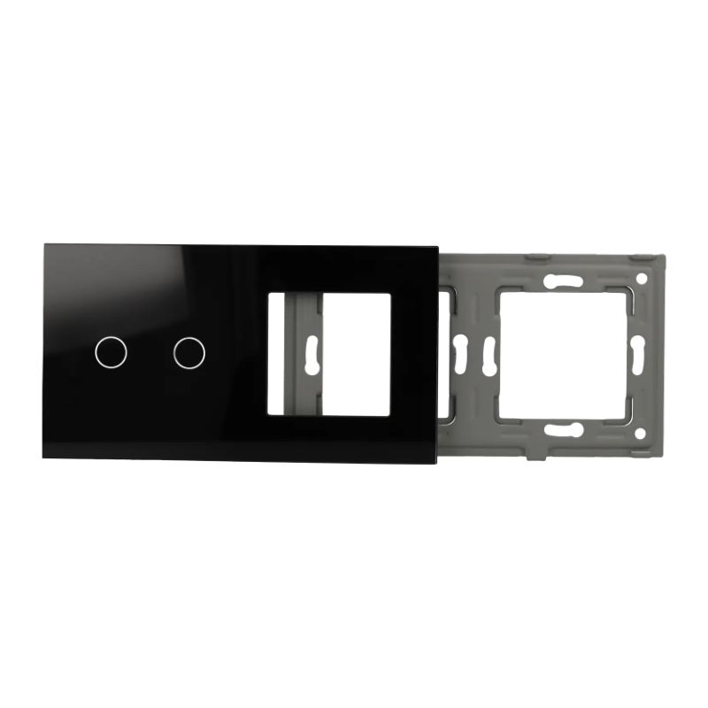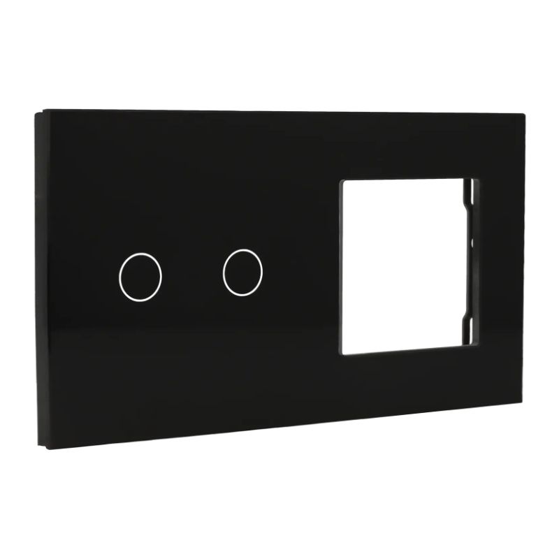 Painel elegante em cristal temperado preto com 2 botões touch e retroiluminação integrada. Design ultrafino (16mm) para instalação em moldura única, ideal para projetos de automação residencial modernos. Toque suave e resposta tátil para controle de iluminação e cenários. Fácil integração em sistemas inteligentes — a solução estética e funcional para ambientes sofisticados.
