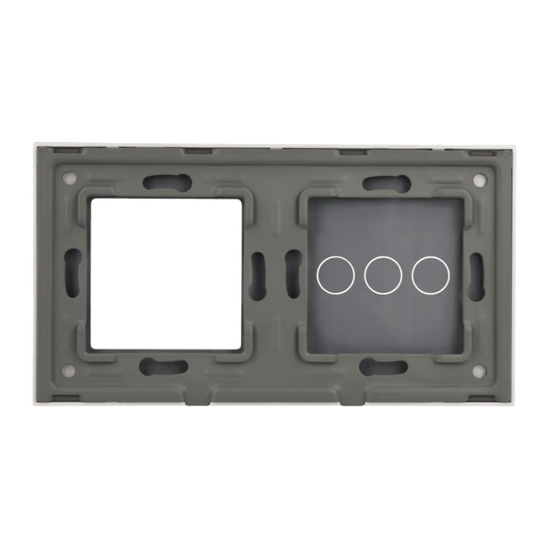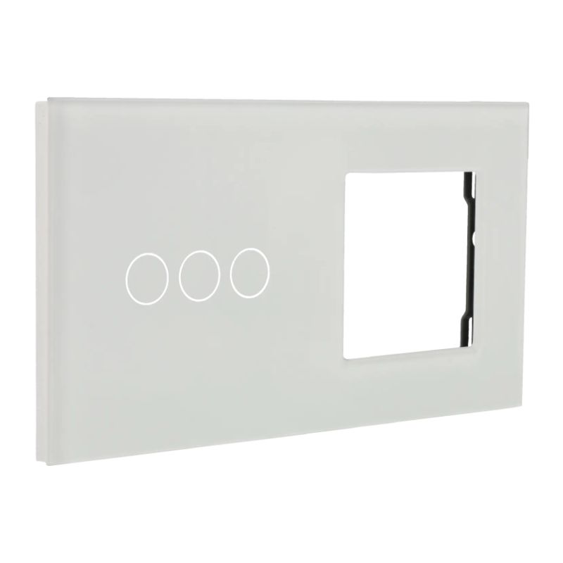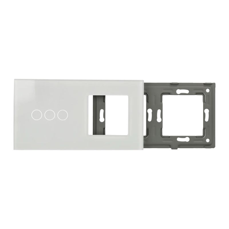Painel touch triplo em vidro temperado branco com moldura integrada para 1 dispositivo (157x86x16 mm). Design elegante e sofisticado com retroiluminação e tecnologia de ativação tátil. Ideal para projetos de automação residencial que exigem múltiplos controlos num formato compacto e esteticamente refinado.