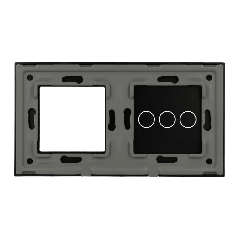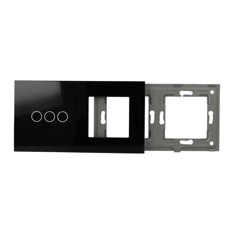 Painel touch triplo em vidro temperado preto com moldura integrada para 1 dispositivo (157x86x16 mm). Design elegante e sofisticado com retroiluminação e tecnologia de ativação tátil. Ideal para projetos de automação residencial que exigem múltiplos controlos num formato compacto e esteticamente refinado.
