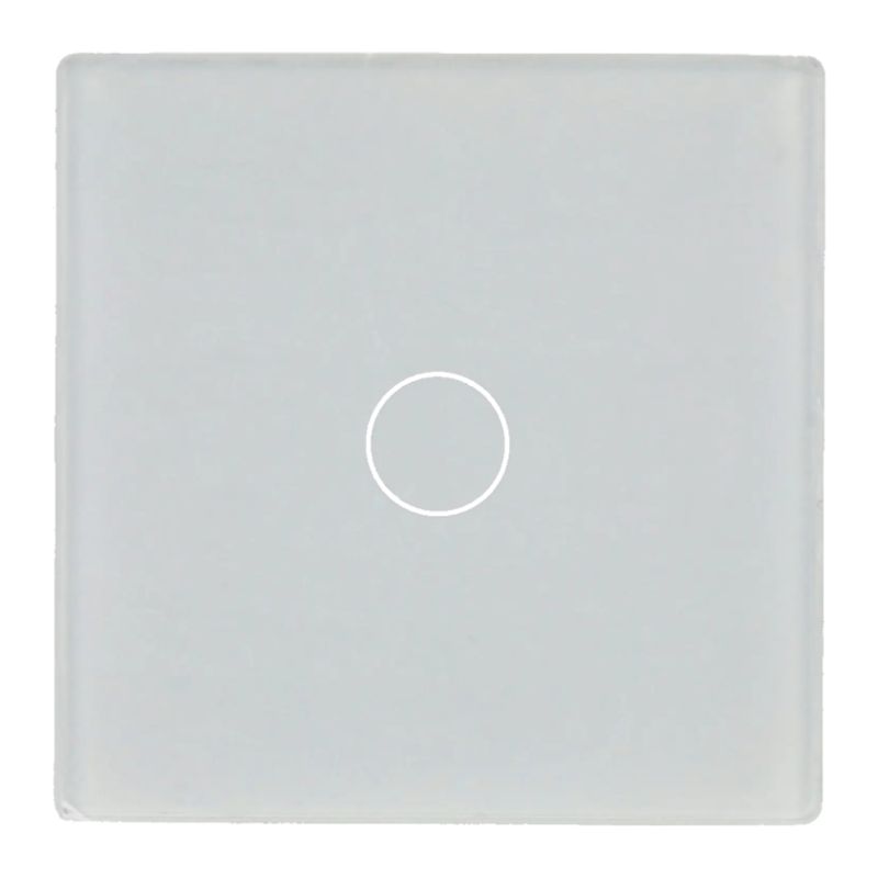 Interruptor touch quadrado minimalista (47x47x3 mm) em vidro temperado branco com backlight. Tecnologia de ativação tátil e espessura ultrafina de apenas 3mm. Peso leve (15g) e acabamento brilhante — ideal para controlo pontual de iluminação em projetos de smart home ou ambientes claros e contemporâneos.