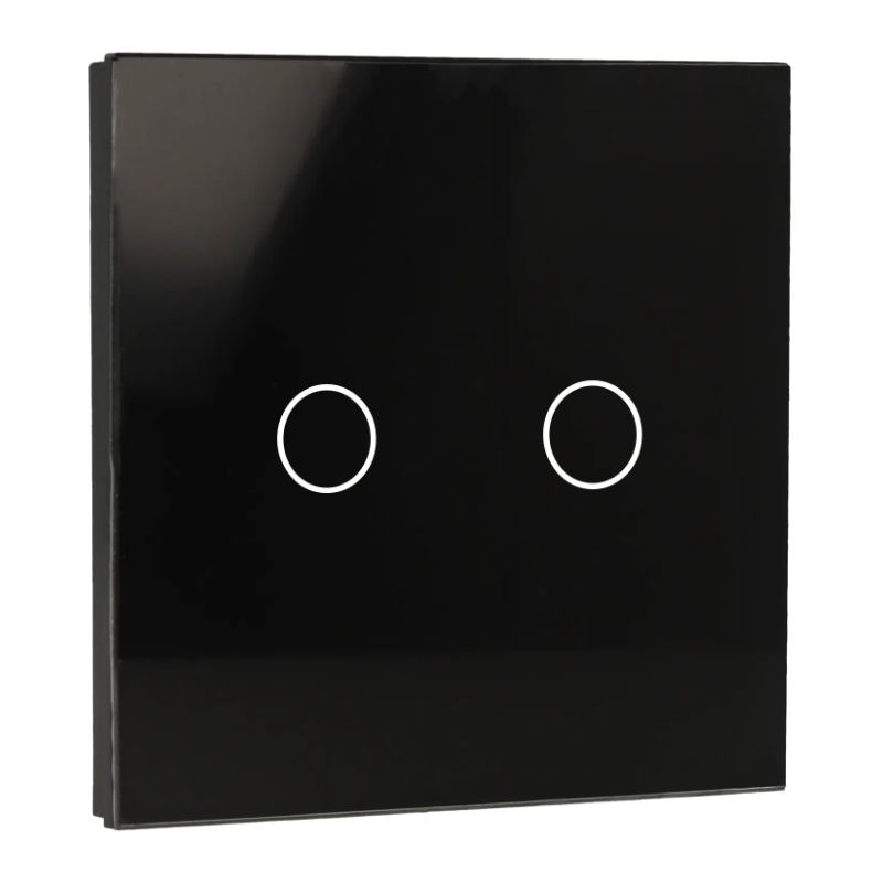 Painel único em vidro temperado preto com 2 botões touch independentes e retroiluminação. Design quadrado elegante (86x86x16 mm) para controle duplo de iluminação em ambientes residenciais ou comerciais. Tecnologia sensível ao toque e instalação simplificada. Ideal para projetos modernos que exigem funcionalidade e estética minimalista.