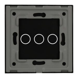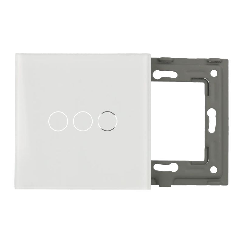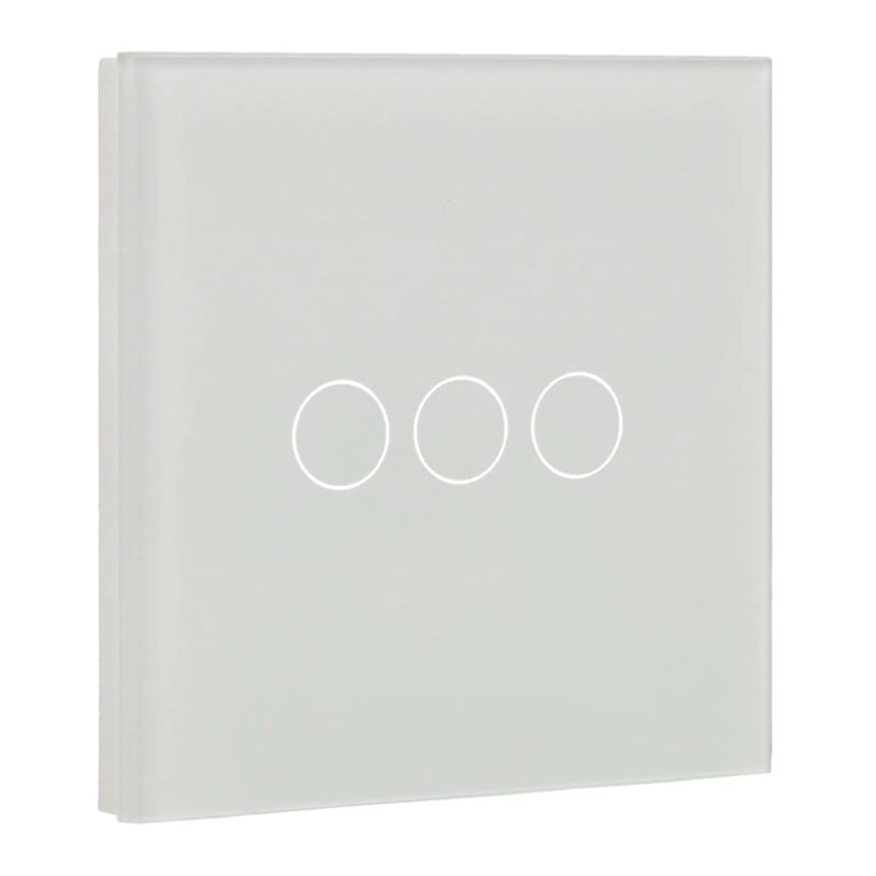 Painel único em vidro temperado branco com 3 botões touch independentes e retroiluminação. Design quadrado elegante (86x86x16 mm) para controle múltiplo de iluminação em ambientes residenciais ou comerciais. Tecnologia sensível ao toque e instalação simplificada. Ideal para projetos modernos que exigem funcionalidade e estética minimalista.