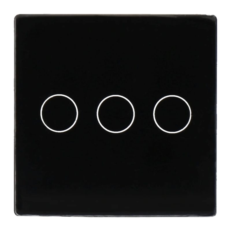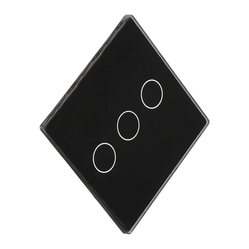 Painel de interruptor único com 3 botões touch independentes e retroiluminação, fabricado em vidro temperado preto. Design extremamente compacto e fino (47x47x3 mm), ideal para integração discreta em ambientes modernos. Controlo elegante e sensível ao toque para até três circuitos de iluminação. Instalação simplificada em ambientes residenciais ou comerciais.