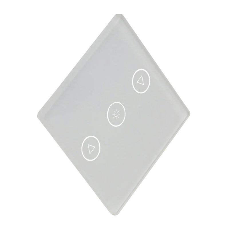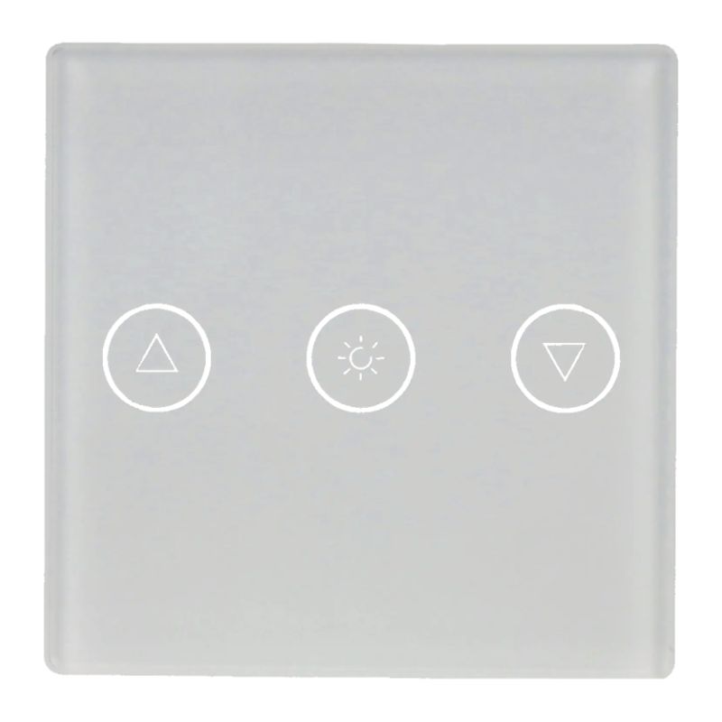 Interruptor touch quadrado (47x47x3 mm) em vidro temperado branco para controlo de estores ou cortinas motorizadas. Design ultracompacto e mínimo (3mm de espessura) com retroiluminação integrada. Ideal para integração discreta em projetos de automação residencial, permitindo o controlo elegante de sistemas de sombreamento em ambientes claros.