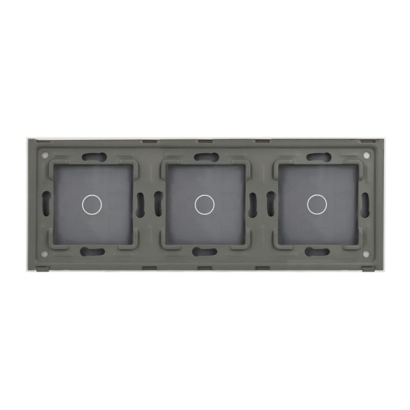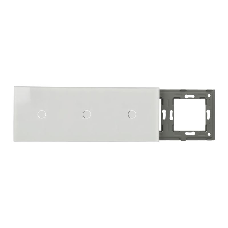 Painel triplo com tecnologia touch e backlight em vidro temperado branco. Design expandido (228x86x16 mm) para controlar três circuitos de iluminação de forma independente. Acabamento premium e resistente, com ativação tátil e retroiluminação suave. Ideal para projetos de automação residencial que exigem múltiplos controlos num formato elegante e minimalista.