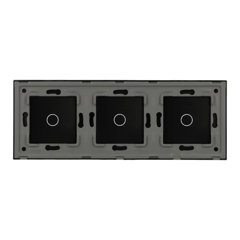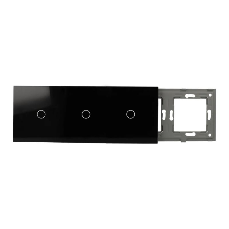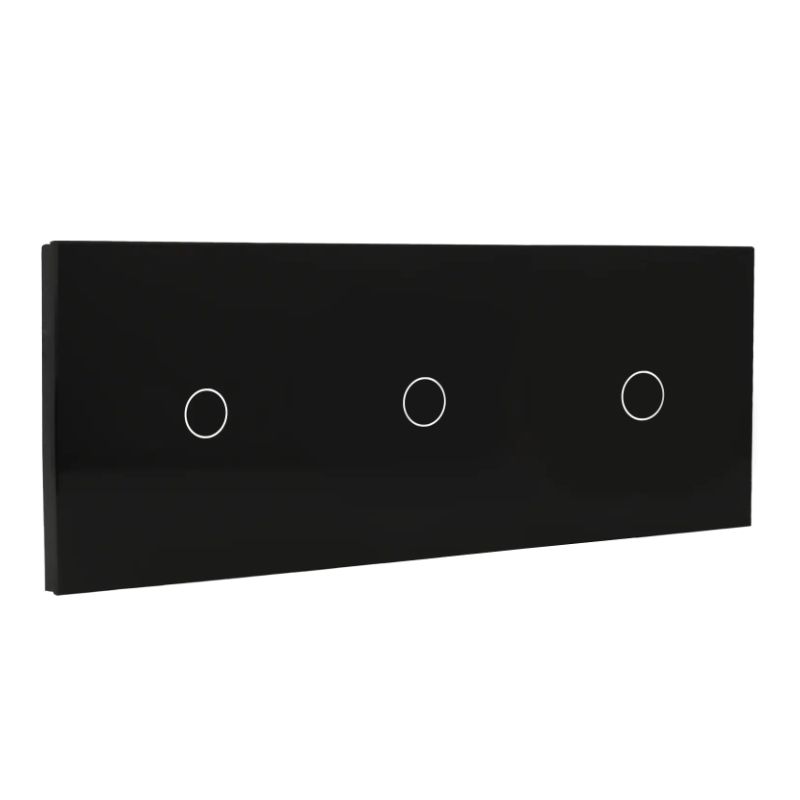 Painel de interruptores triplo com tecnologia touch e backlight, em vidro temperado preto. Design expandido (228x86x16 mm) para controlo de três circuitos independentes num único elemento. Acabamento em cristal temperado resistente e estética minimalista — ideal para projetos de automação residencial e ambientes que exigem múltiplos controlos com estilo sofisticado.