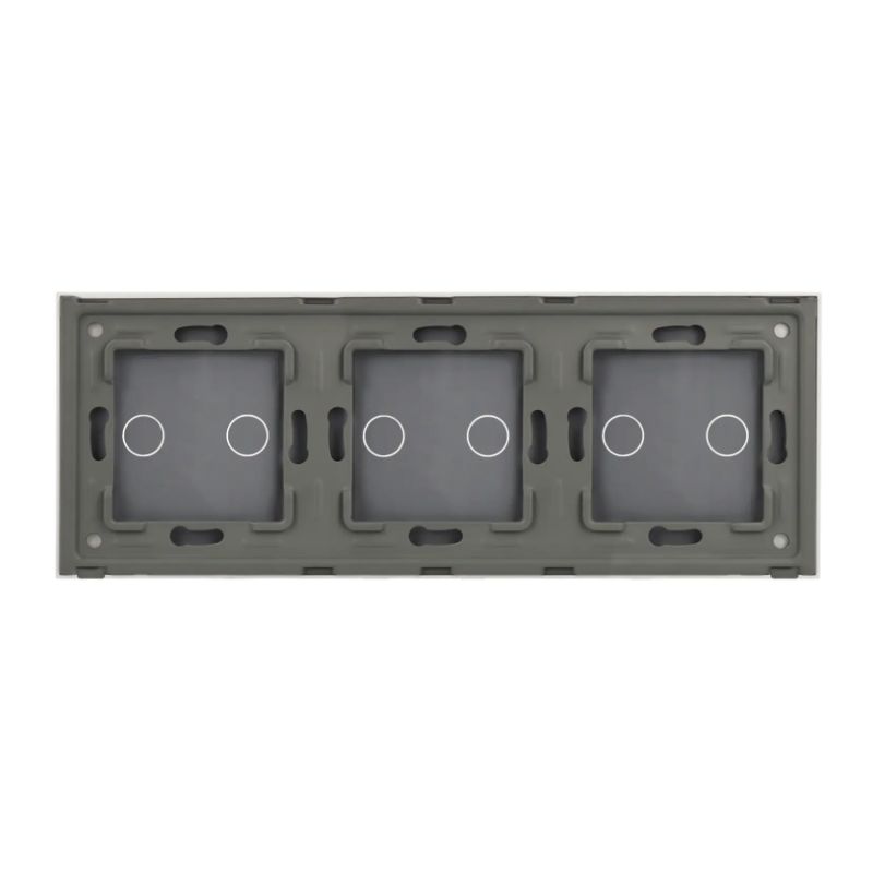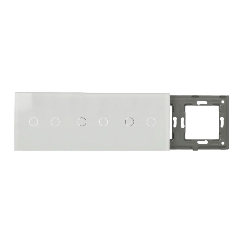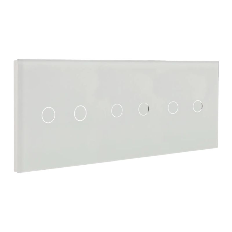 Painel triplo em vidro temperado branco com 6 botões touch independentes e retroiluminação. Design extra-longo (228x86x16 mm) para controle centralizado de múltiplos circuitos de iluminação. Tecnologia sensível ao toque e acabamento premium. Ideal para entradas, salas e ambientes comerciais que exigem controle extenso e elegante.