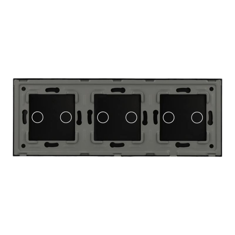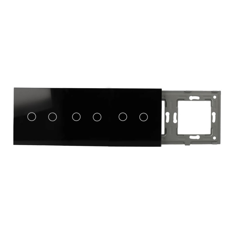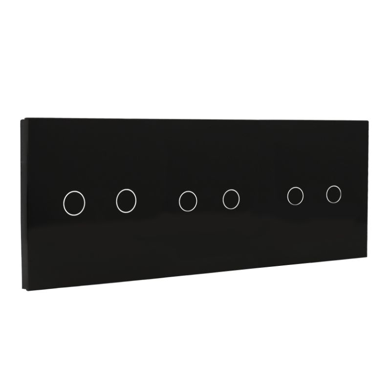 Painel triplo em vidro temperado preto com 6 botões touch independentes e retroiluminação. Design extra-longo (228x86x16 mm) para controle centralizado de múltiplos circuitos de iluminação. Tecnologia sensível ao toque e acabamento premium em vidro. Ideal para entradas, salas e ambientes comerciais que exigem controle extenso e elegante.