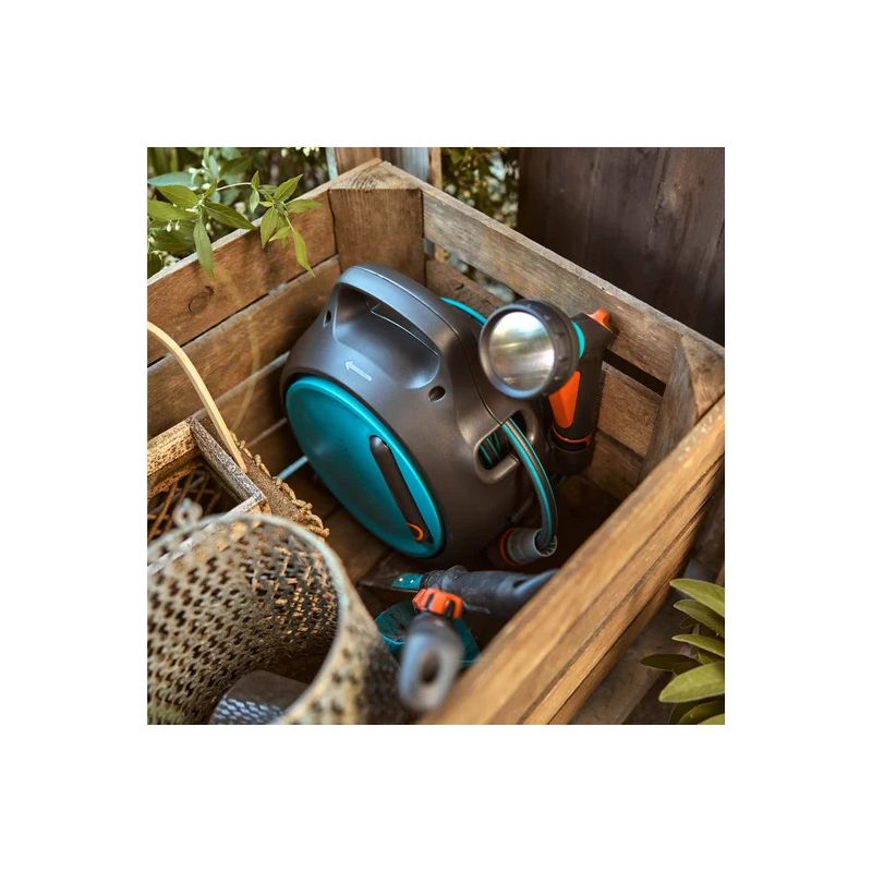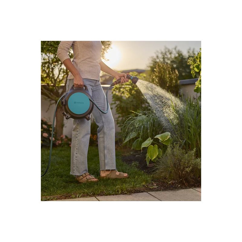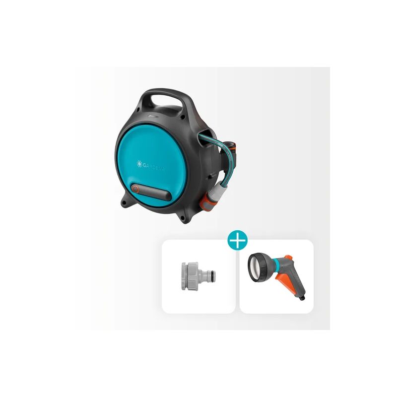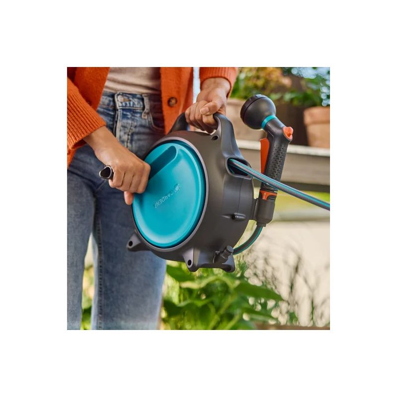 | Características particulares | Extensão fácil: a mangueira desenrola-se ao caminhar, suporte integrado para dispositivos, sistema anti-gotejamento, leve e compacta, mangueira fácil de enrolar graças ao dispositivo de enrolamento externo |