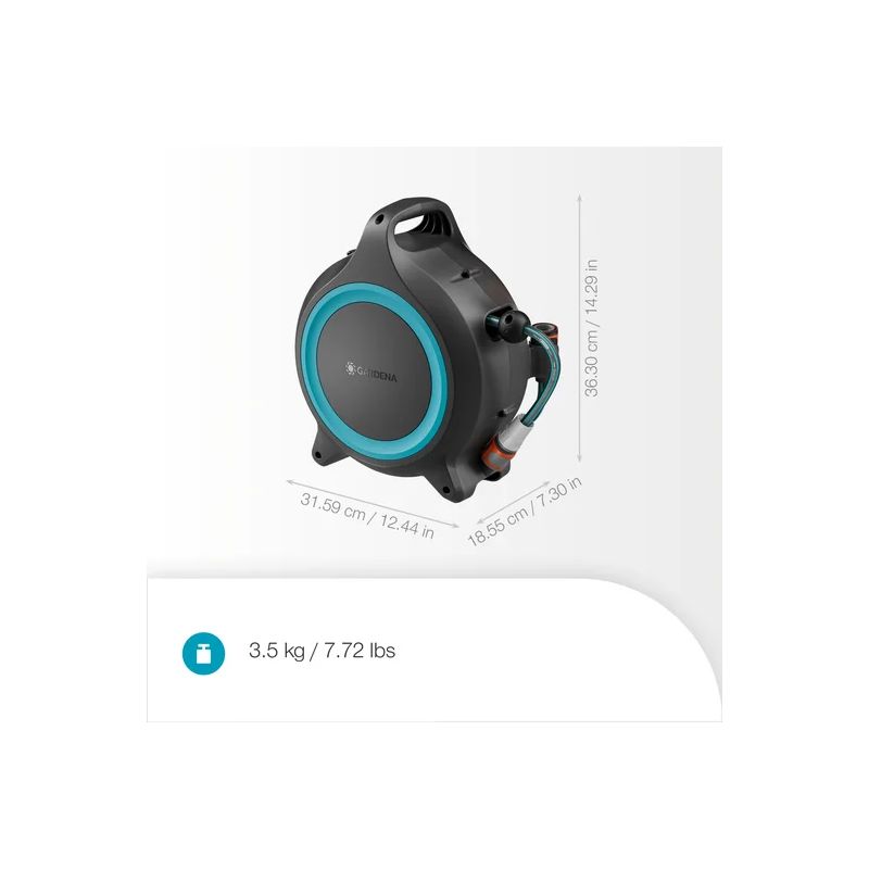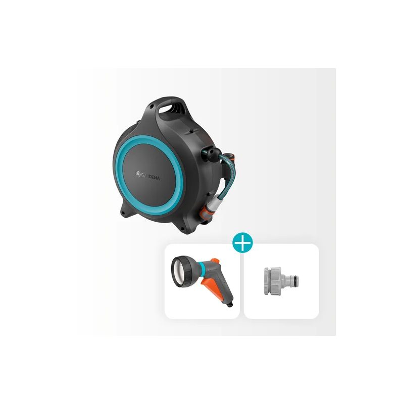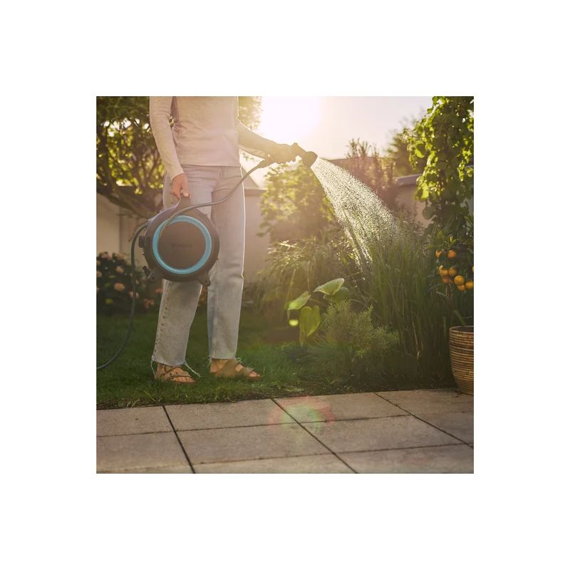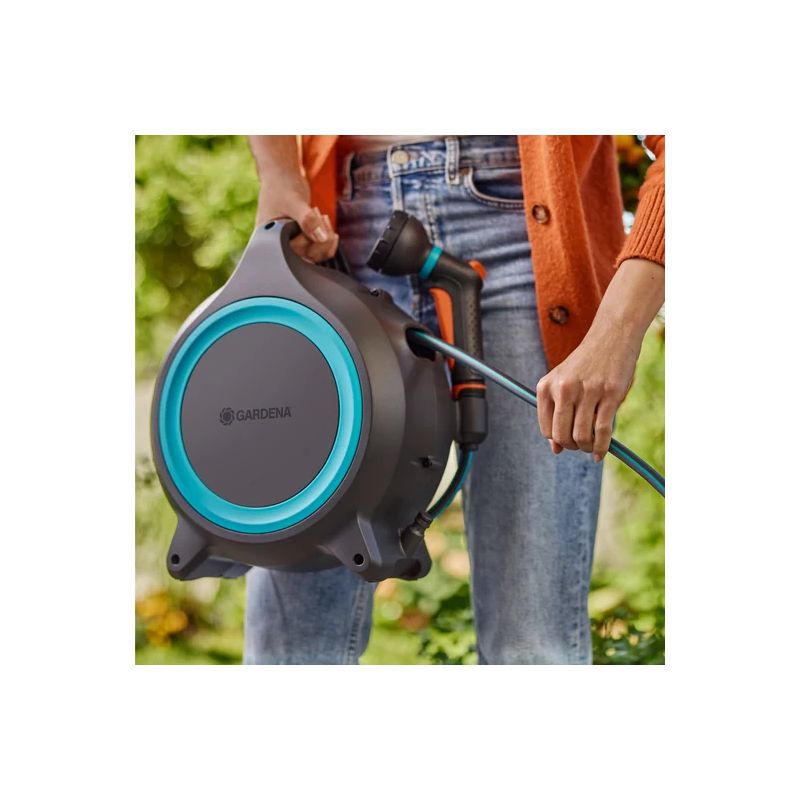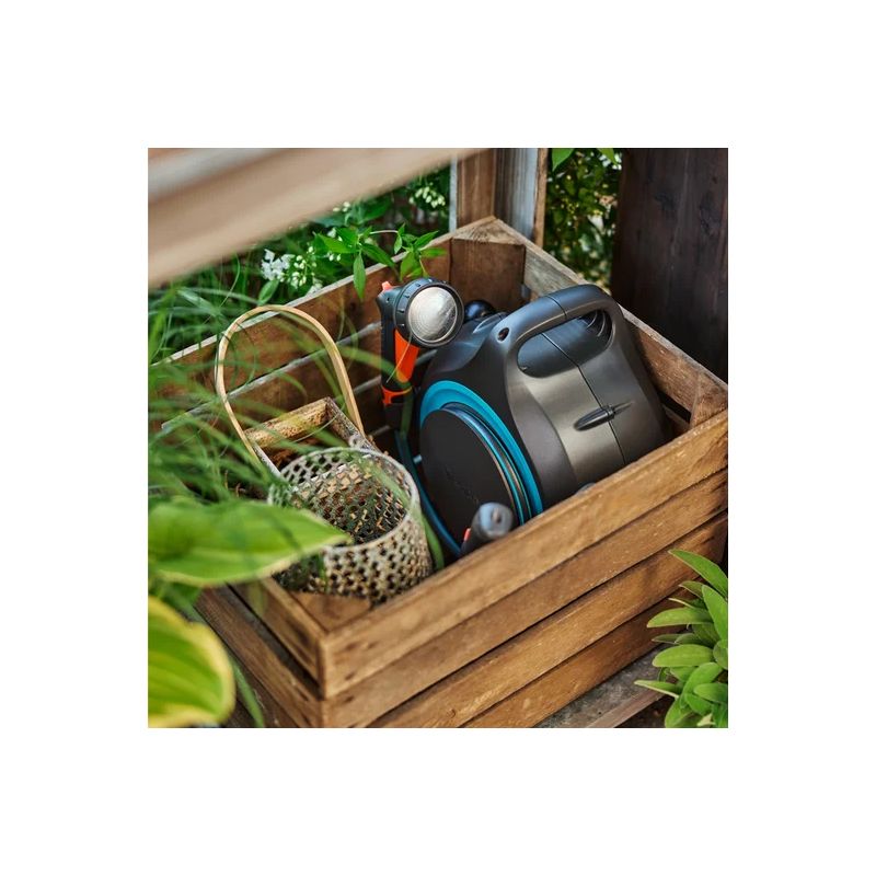 | Características particulares | Extensão fácil: a mangueira desenrola-se ao caminhar, suporte integrado para dispositivos, sistema anti-gotejamento, leve e compacta, mangueira fácil de enrolar graças ao dispositivo de enrolamento externo |