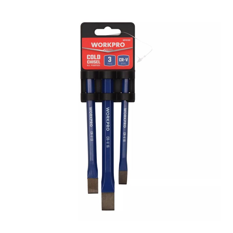 Talha-frio, Conjunto de 3 Peças WorkPro, pesa 0,345 kg e é na cor azul. As medidas das peças são 10 x 8 x 142 mm, 13 x 10 x 152 mm e 16 x 13 x 172 mm. É feito de aço cromado temperado – vanádio.