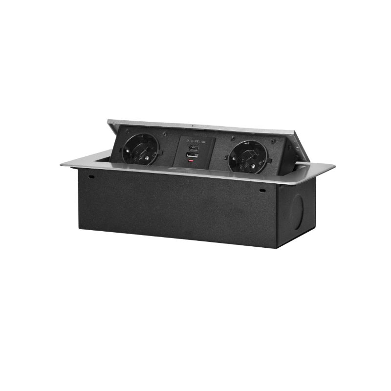 A tomada embutida para móveis com borda plana e fresada se caracteriza não apenas por seu design minimalista, mas também por sua funcionalidade. A borda fresada permite uma instalação estética do conjunto de tomadas, de modo que o furo de montagem e as linhas de corte permaneçam cobertos. Uma característica distintiva do novo modelo Powerbox é a estrutura inferior completa, que facilita a instalação e aumenta a segurança. A ausência de acesso às tomadas e um prensa-cabos adicionalmente coberto com vedação de borracha protegem contra entrada indesejada e danos mecânicos. A tomada também possui persianas de segurança e toda a estrutura permite fechar a tampa articulada e ocultar o dispositivo não utilizado na bancada.