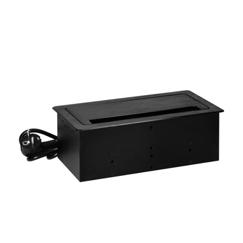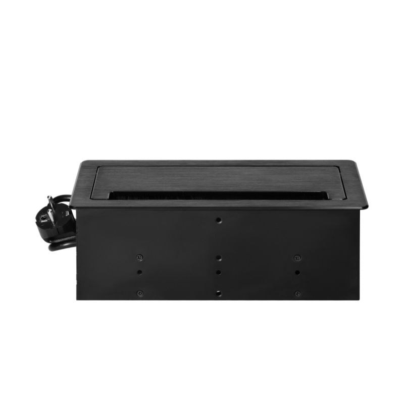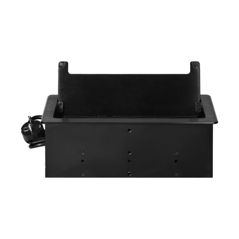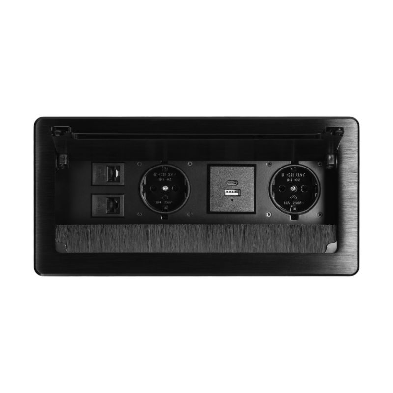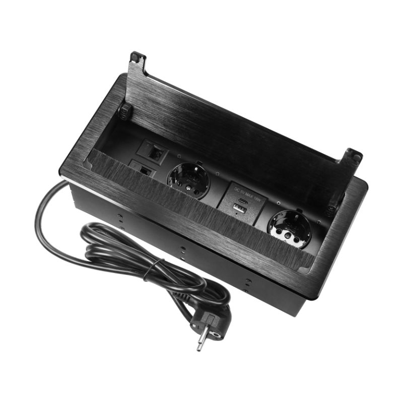 A tomada embutida para móveis com borda plana fresada não é apenas um dispositivo prático, mas também uma adição elegante a qualquer interior moderno. Funciona perfeitamente tanto em casa como no escritório. Duas tomadas do tipo Schuko (2x2P+E) e duas portas USB integradas (tipos A+C) permitem ligar até quatro dispositivos ao mesmo tempo. Além disso, o aparelho também possui duas tomadas de rede (NET) para conectá-lo facilmente à Internet ou para conectar dois computadores a uma rede LAN. O fio de 1,5 m de comprimento garante uma instalação fácil, e a secção transversal do fio de 3×1,5 mm2 garante um funcionamento seguro. A tomada é feita de uma liga de zinco e aço de alta qualidade, graças à qual é resistente a danos. A escova anti-poeira incorporada protege eficazmente a tomada contra poeira e sujidade. A tomada é preta, de forma retangular (130×265 mm). A espessura da borda fresada é de apenas 2 mm, o que confere um efeito de subtileza e um acabamento discreto. A tomada é perfeita para salas secas interiores, tais como escritórios, salas de estudo, salas de conferências ou salas de estar.