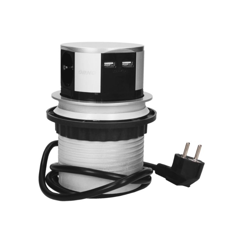 Um conjunto de três tomadas elétricas 2P+Z com carregador USB integrado, na estrutura superior retrátil, fornece acesso às tomadas elétricas. Após pressionar a estrutura, o mecanismo preciso avança o painel com as tomadas automaticamente. Projetado para instalação interna em mesas, tampos de mesa e móveis de escritório. Para instalar o dispositivo em um tampo de mesa, é necessário apenas um furo de 10 cm de diâmetro e 10 cm de profundidade. Ele vem equipado com um cabo de 1,5 m de comprimento. Plástico + alumínio.