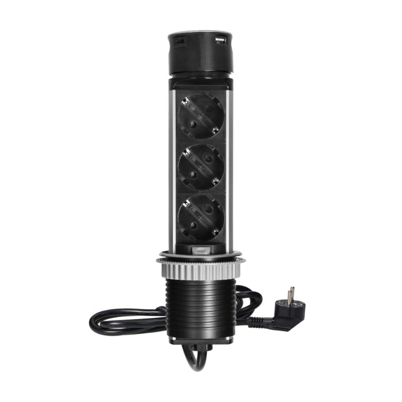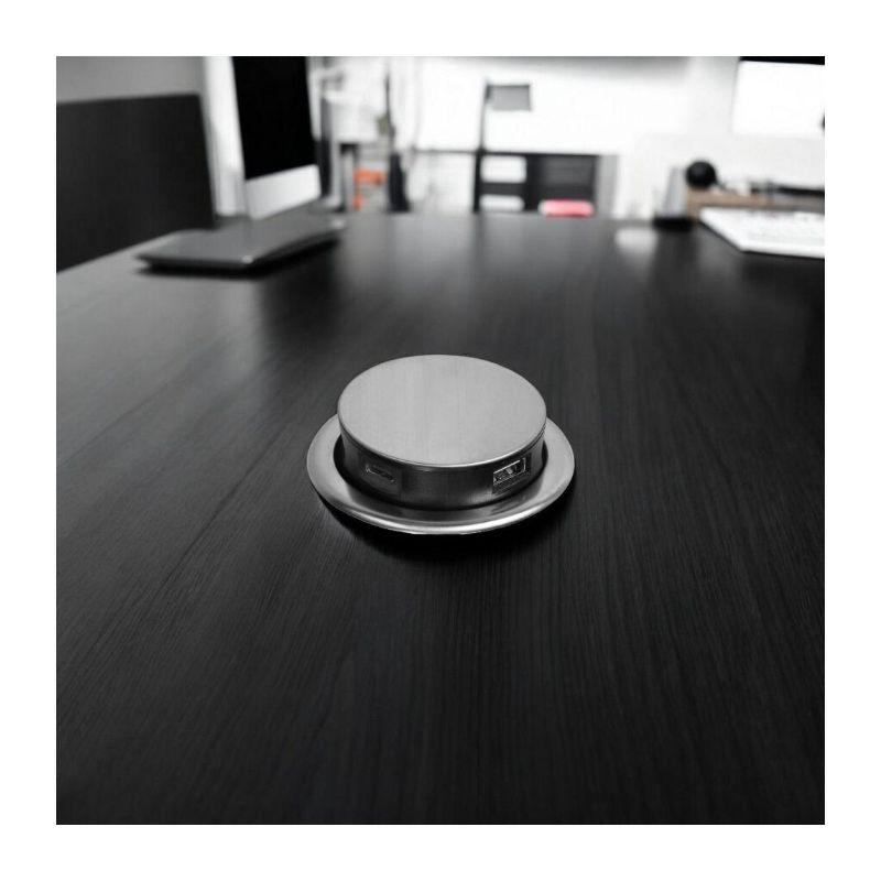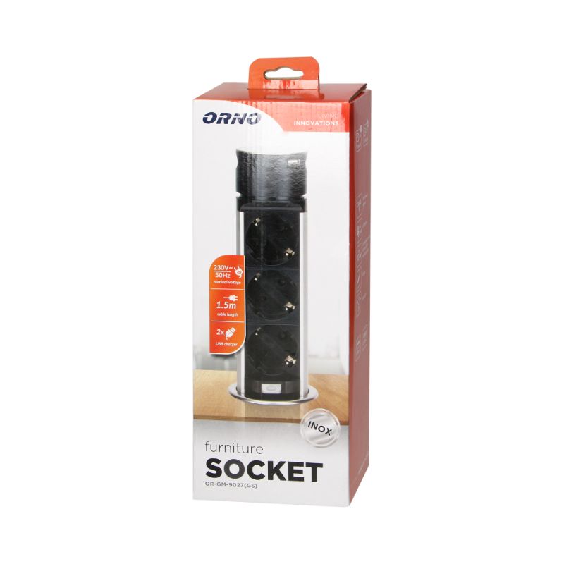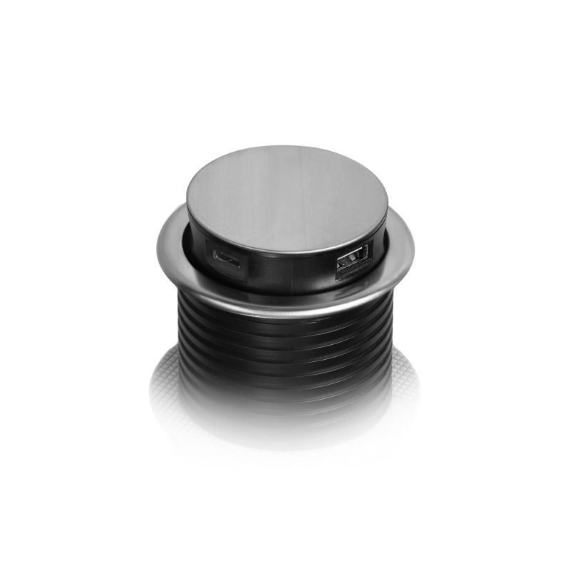 - 1 Tomada Embutida para Móveis Ø6cm com Carregador USB e Cabo de 1,5m, 3x2P+E, 2xUSB, INOX Orno