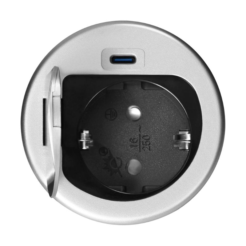 A tomada embutida para móveis de Ø6 cm com tampa não é apenas uma solução prática para conectar dispositivos, mas também um complemento elegante para qualquer interior moderno. Funciona perfeitamente tanto em casa quanto no escritório. Uma tomada tipo Schuko (1x2P+E) com carga máxima de 3680 W e porta USB integrada (tipo C) permitem conectar dois dispositivos ao mesmo tempo. A saída do carregador USB é de 5 V/3 A; 9 V/2,22 A; 12 V/1,67 A com carga máxima de 20 W. O cabo de 1,9 m de comprimento garante uma instalação suave e a seção transversal do fio de H05VV-F3x1,5 mm² garante uma operação segura. A tomada é feita de plástico de alta qualidade, portanto, é resistente a danos. A tomada é prateada, com formato redondo (o diâmetro mede 6 cm). Funciona perfeitamente em ambientes secos, como escritórios, salas de estudo, salas de conferência e salas de estar.